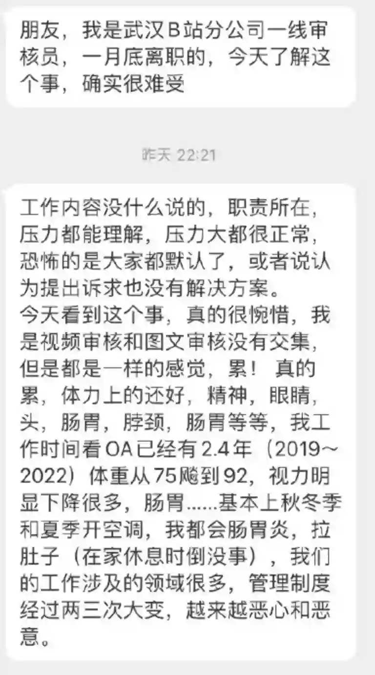 今天看到这个事,真的很惋惜,我是视频审核和图文审核没有交集但是都是一样的感觉,累!真的累,体力上的还好,精神,眼睛头,肠胃,脖颈,肠胃等等,我工作时间看OA已经有24年(2019~2022) 体重从75飚到92,视力明显下降很多,肠胃……基本上秋冬季和夏季开空调,我都会肠胃炎,拉肚子 (在家休息时倒没事) ,我们的工作涉及的领域很多,管理制度经过两三次大变,越来越恶心和恶意。