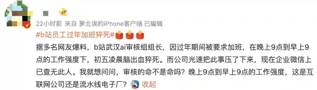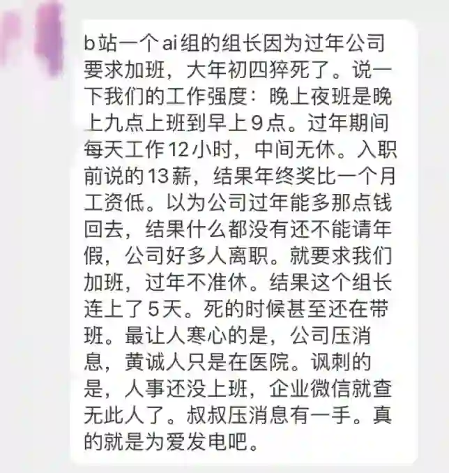 7日,一位微博用户称,「据多名网友爆料,B站武汉AI审核组组长,因过年期间被要求加班,5日凌晨脑出血猝死。」
