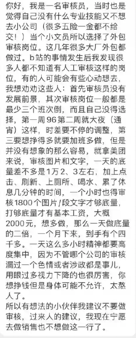 一位网友称自己目前就是一位外包审核人员,他劝谏想要做这行的人: