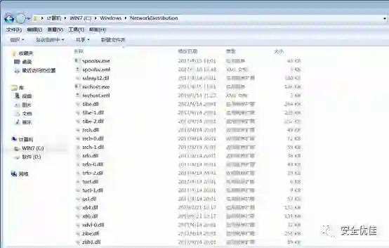 释放“永恒之蓝”攻击工具包到C:\Windows\NetworkDistribution目录,攻击网络中的其它机器。