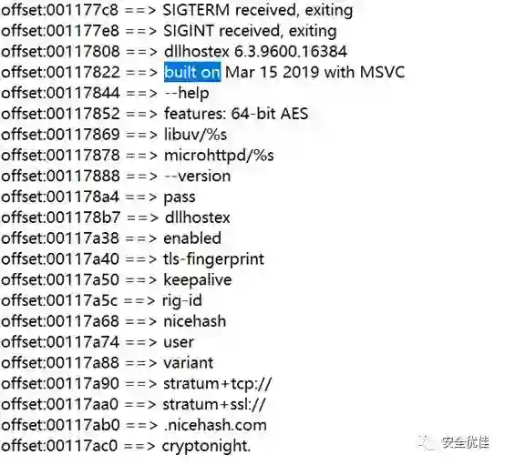 释放挖矿模块dllhostex.exe,挖矿消耗系统资源。挖矿模块使用开源挖矿程序修改而来,此版本将挖矿相关字符串进行了大量的替换,进一步对抗查杀。