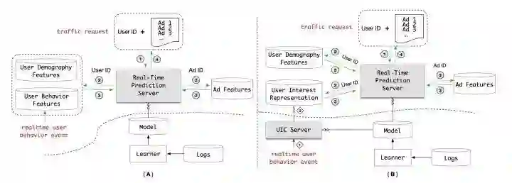 B架构将A架构的“用户行为特征(User Behavior Features)在线数据库”替换成了“用户兴趣表达(User Interest Representation)在线数据库”。
