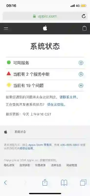 截止消息发布,苹果基于 iCloud 的服务有 19 个出现了间歇性问题。 但是,iMessage,地图流量(和搜索,路由和导航),iTunes U,Apple ID,Apple Music,App Store 和 Apple Pay 等服务仍然可以正常运行。