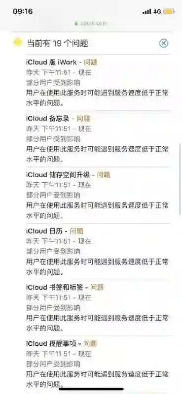 对于图中黄色部分的问题,苹果说“一些用户会受到影响”,“该服务的性能可能会比平常慢”,但是用户和第三方开发者都反馈说他们无法访问自己的 iCloud 数据。