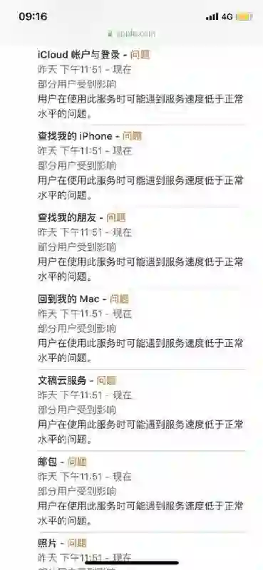 在苹果的系统状态页面中,苹果也注意到 iCloud 发生了广泛的服务中断,但苹果提示并不是每个人的手机都会受到影响。