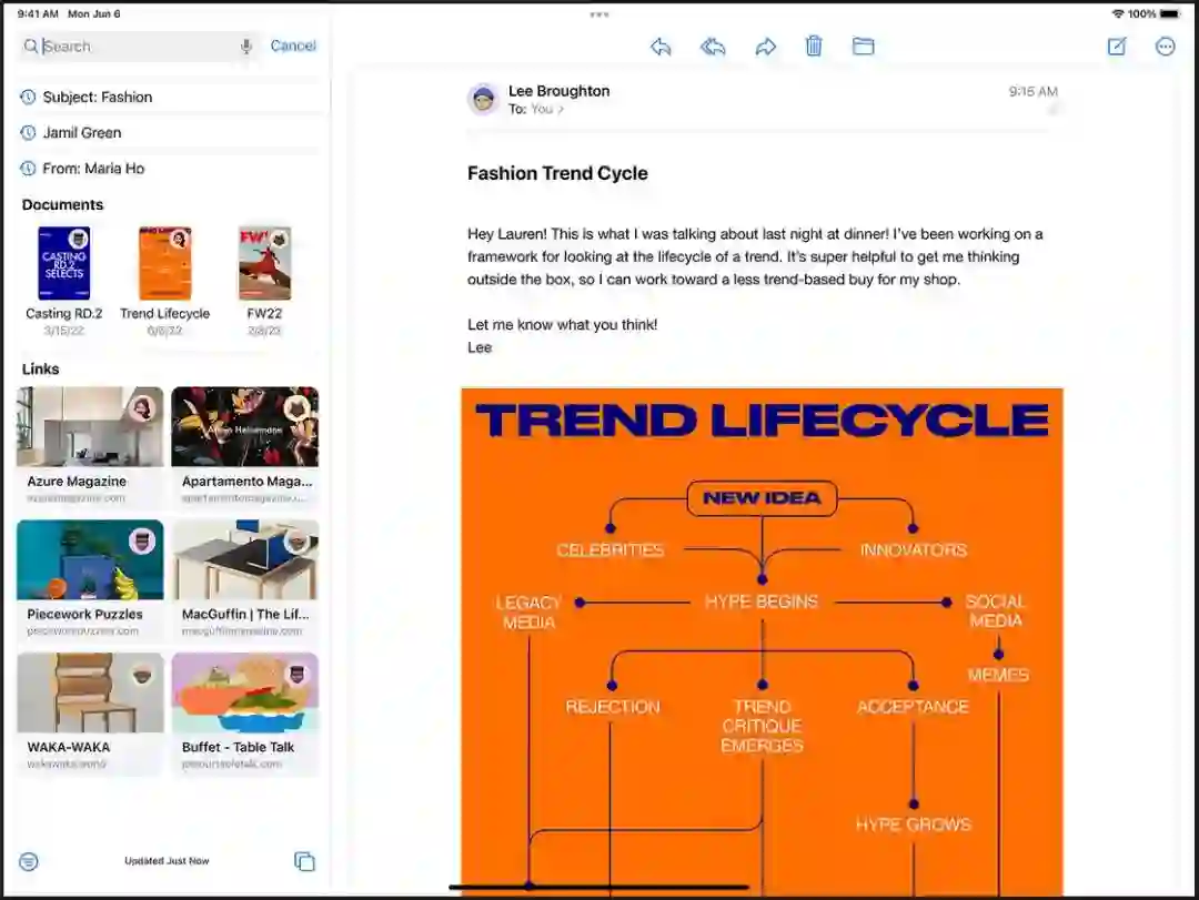 很多时候,我们也需要跟进某些邮件中的内容。iPadOS 16 支持设置提醒日期和时间,届时邮件会把设置了提醒的邮件放在收件箱的顶部;还可以把已经发送的邮件置顶,这样就不会忘记稍后需要跟进的工作。