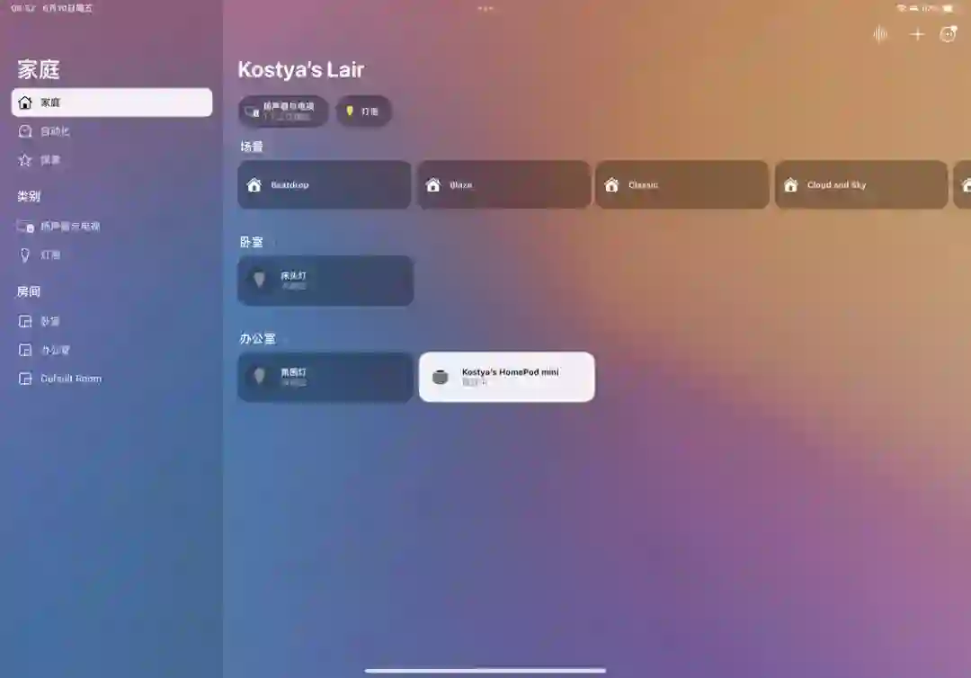 「家庭」app 也经过了重新设计。以往需要分不同房间进行配件控制,但是如今只需要在一个统一的「家庭」标签页中就可以一览所有的 HomeKit 配件。同时,还推出了「类别」功能,可以一键筛选类别相同的 HomeKit 配件,比如灯泡、扬声器等。此外,「家庭」app 新增了一些渐变色壁纸可以作为背景使用。不过需要注意的是,升级到 iPadOS 16 的 iPad 不能再用作家庭中枢。