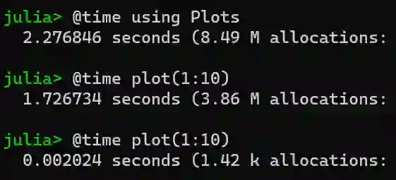 由于 Julia 动态编译的特性,函数在第一次执行的时候需要触发一次编译操作,因此当使用一些比较大的工具箱(比如说 Plots、Makie)时,就会遇到比较漫长的等待环节。