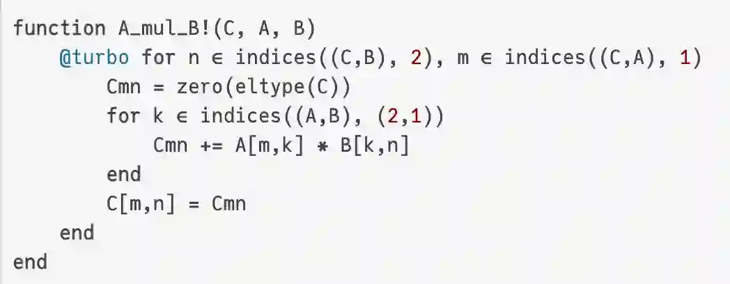 下图是 LoopVectorization 对矩阵乘法实现进行优化后的实现,在这里 @turbo 可以看到,LoopVectorization 取得了与 MKL 接近的性能。