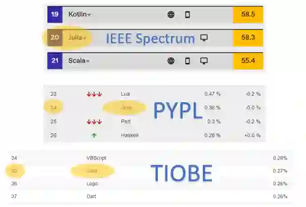 从各大编程排行榜来看,Julia 的整体排名稳中有升。根据 IEEE Spectrum 的排名,今年 Julia 新入榜,位于第 20 位。在 PYPL 的排名中,目前 Julia 位于第 24 位,相比去年同期变化不大,不过占比由去年的 0.26% 增长至了 0.36%。而在本月最新的 TIOBE 排名中,Julia 位于 35 名,相较去年变化不大。