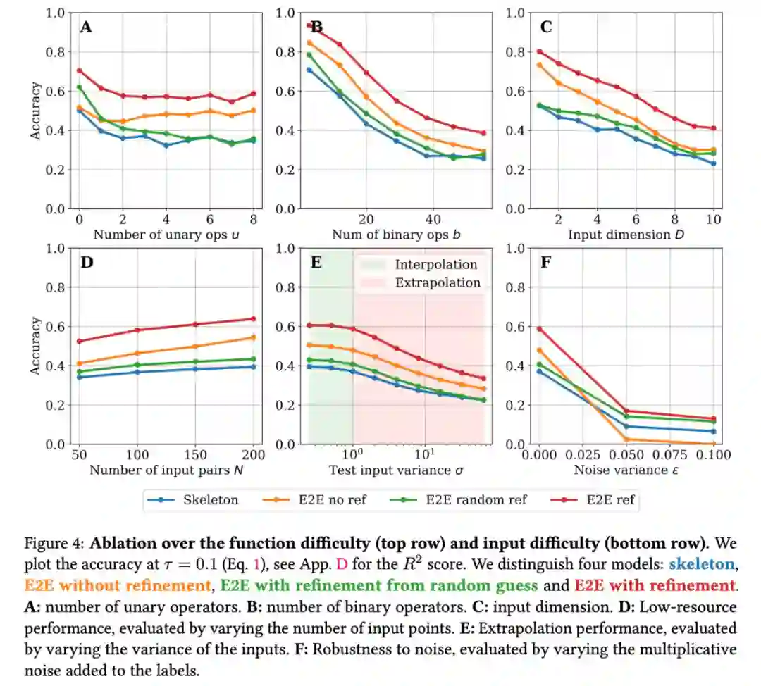 最后,如图 4F 所示,研究者检查了使用方差 σ 的乘性噪声(multiplicative noise)对目标 y 的影响:y → y(1 + ξ), ξ ∼ N (0, ε)。这个结果揭示了一些有趣的事情:如果不进行修正,E2E 模型对噪声的稳健性不强,实际上在高噪声下性能比 skeleton 模型差。这显示了 Transformer 在预测常数时对输入的敏感程度。修正之后 E2E 模型的稳健性显著提高,但将常数初始化为估计值的影响较小,因为常数的预测被噪声破坏了。