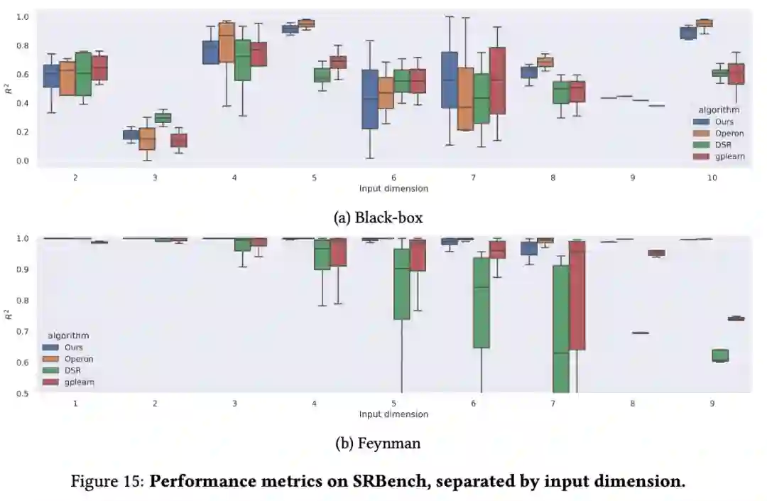 图 4A、B、C 给出了 3 个公式难度指标的消融实验结果(从左到右):一元算子的数量、二元算子的数量和输入维数。正如人们所预料的那样,在所有情况下,增加难度系数会降低性能。这可能会让人认为该模型在输入维度上不能很好地扩展,但实验表明,与并发方法相比,该模型在域外数据集上的扩展性能非常好,如下图所示。
