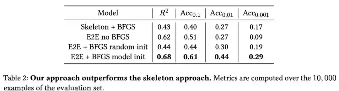 表 2 给出了该模型的平均域内结果。如果不进行修正,E2E 模型在低精度预测(R^2 和 Acc_0.1 指标)方面优于在相同协议下训练的 skeleton 模型,但常数预测中存在的错误会导致在高精度(Acc_0.001)下的性能较低。