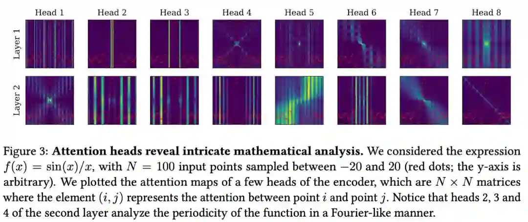 如下图 3 所示,编码器捕获所考虑函数的最显著特征,例如临界点和周期性,并将专注于局部细节的短程 head 与捕获函数全局的长程 head 混合在一起。