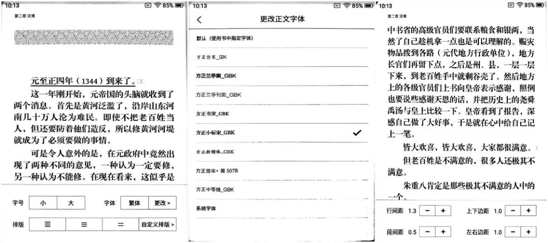字号只有大、小两个选择,但字体包括了方正仿宋、方正兰亭黑、方正兰亭刊黑、方正书宋、方正小标宋、方正新楷体、方正悠宋、方正中等线以及系统字体、书中指定字体,选择还是挺丰富的。