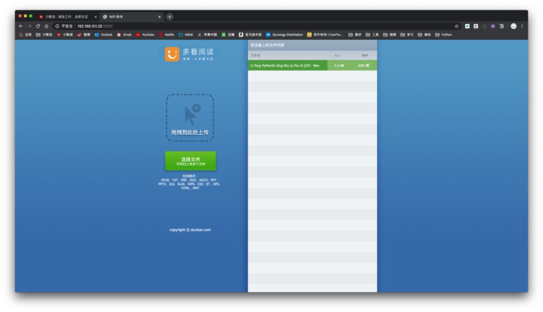 我先测试了一下 WLAN 传书功能,只需在电脑上打开相应的 IP 地址,我就可以进入多看阅读的传书界面。
