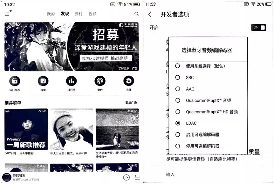 小米多看电纸书其实是有蓝牙功能的,开发者选项里甚至还可以选择 LDAC 协议,于是我试着安装了网易云音乐,也将蓝牙音箱成功配对到了小米多看电纸书上,网易云音乐中的歌曲也可以正常播放,但是我的蓝牙音箱没有发出任何声音。