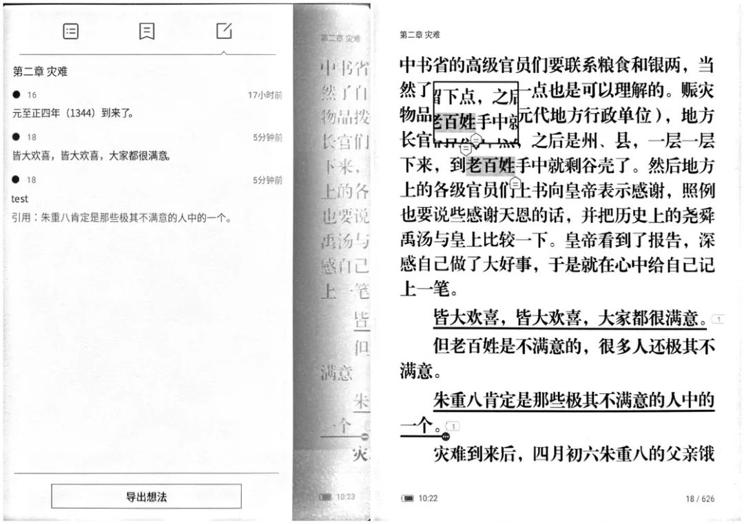 多看阅读的标注功能分为了划线和想法两种,划线对应的就是 Kindle 中的标注,而想法对应的就是 Kindle 中的笔记,并且也可以在「目录、书签、想法」窗口中方便地回顾和导出,导出方式目前有印象笔记和蓝牙传输两种。