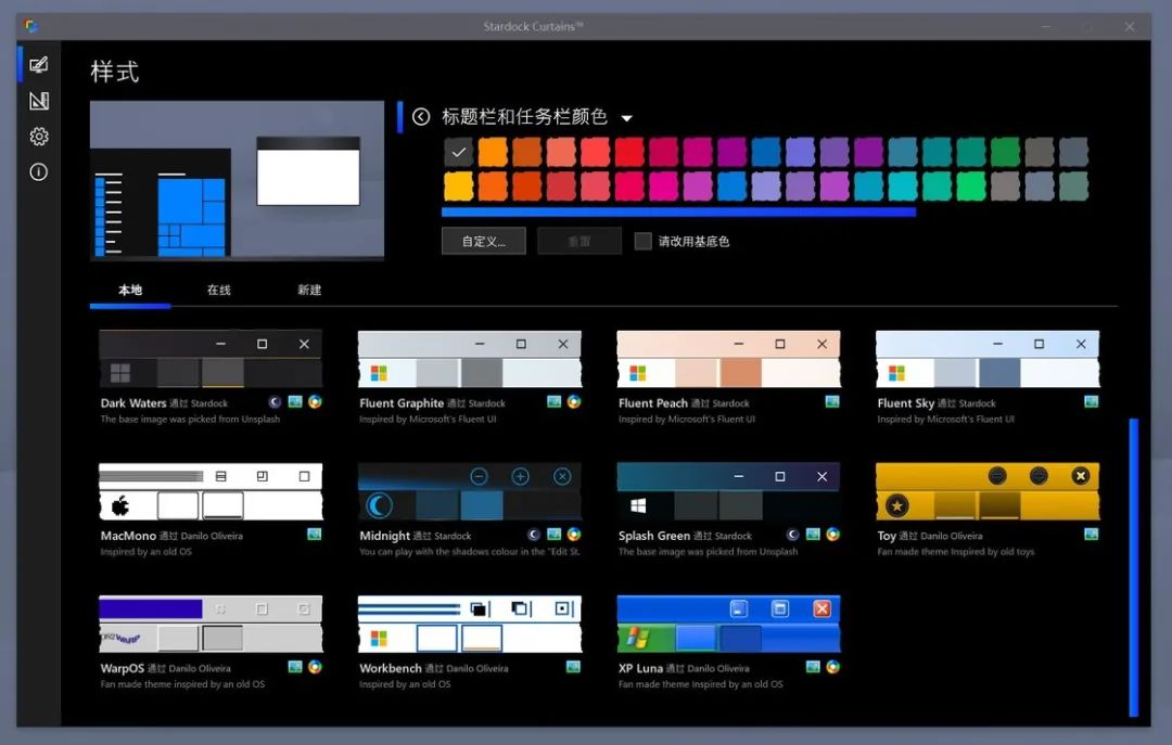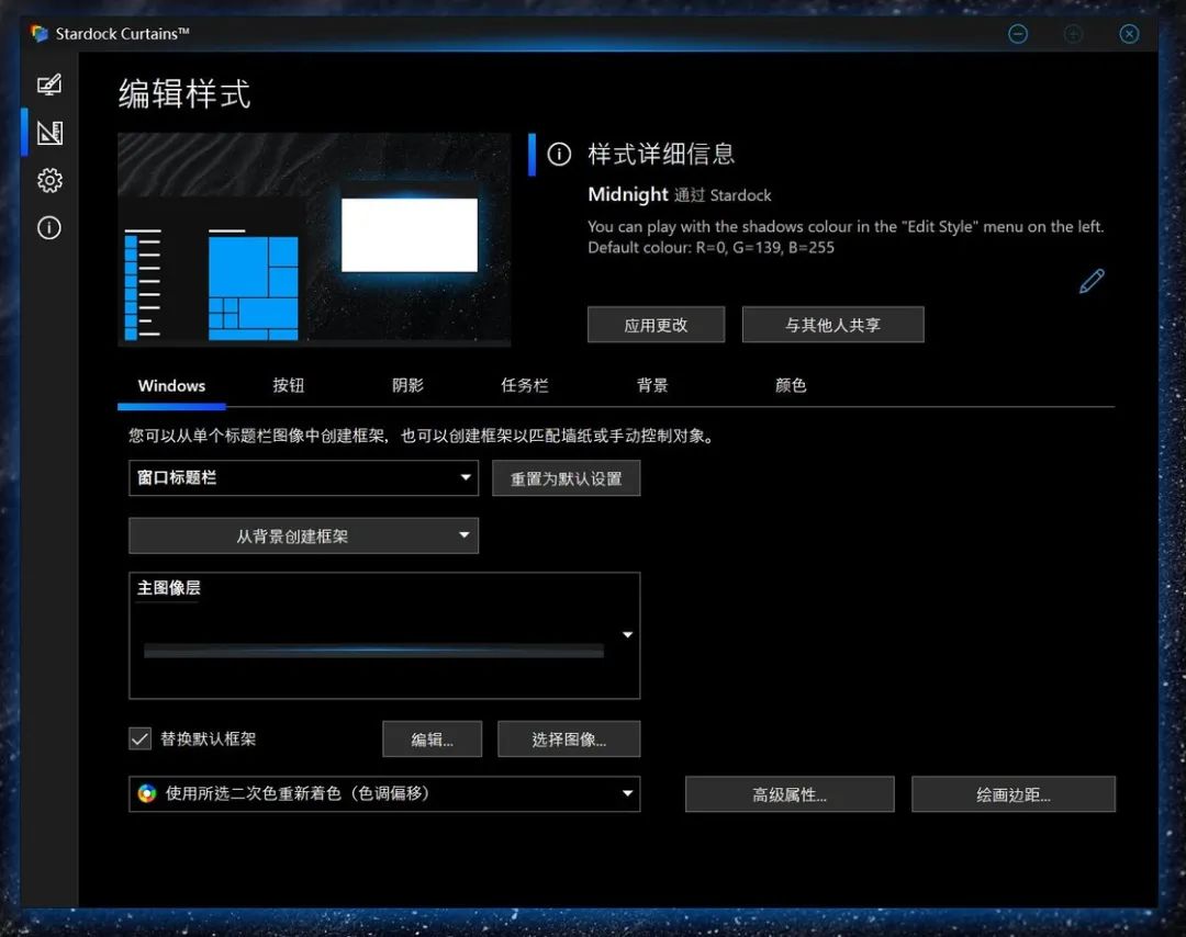 当然,总会有用户不止于满足软件本身提供的这些成品主题,虽说他们都可以一定程度上的自定义,但总会有喜欢完全掌控自己审美的用户,为了满足他们的需求,Stardock 也在 Curtains 种提供了自定义样式编辑功能: