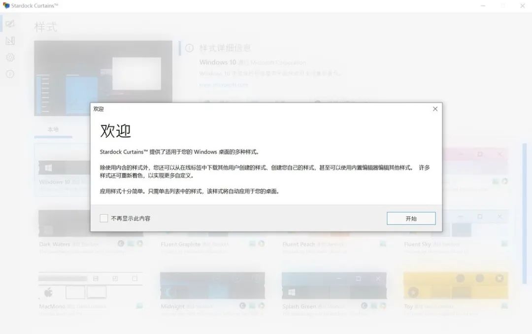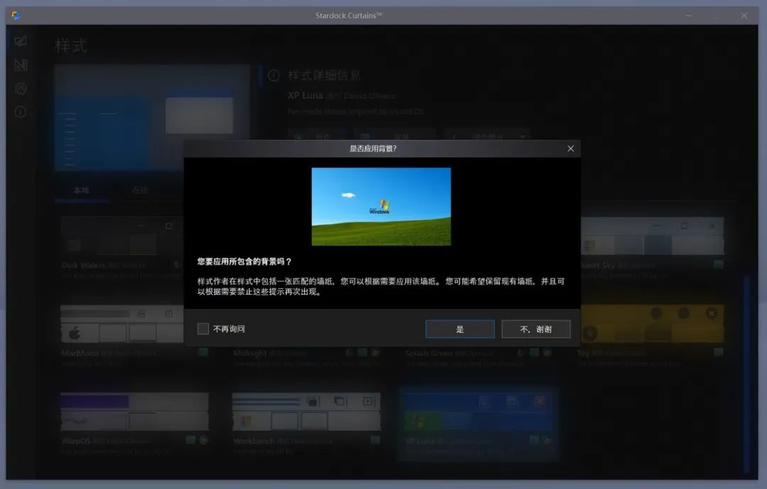 在选定一个外观后,软件会提示你关闭不必要的应用程序或者更换自带的壁纸,以求一次性彻底更换完成: