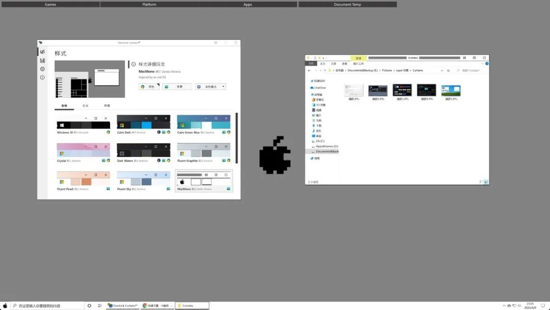 顶部的标签栏是我的另一款桌面整理软件:Fences;可以从外观大致分别出是经典 Macintosh 时代的样式,我们可以观察到底部任务栏的边角处是 Apple 看家的圆角矩形,但是窗口和按钮还没有完全实现,这应该是小惊喜种的一个小遗憾吧。