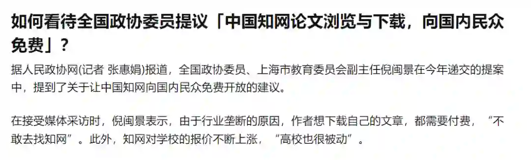为此,还有政协委员在人大会议上提出提案,建议知网免费放开。