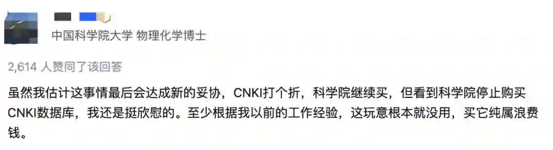 一位中科院的物理化学博士表示,「虽然我估计这事情最后会达成新的妥协,CNKI打个折,科学院继续买,但看到科学院停止购买CNKI数据库,我还是挺欣慰的。至少根据我以前的工作经验,这玩意根本就没用,买它纯属浪费钱。」