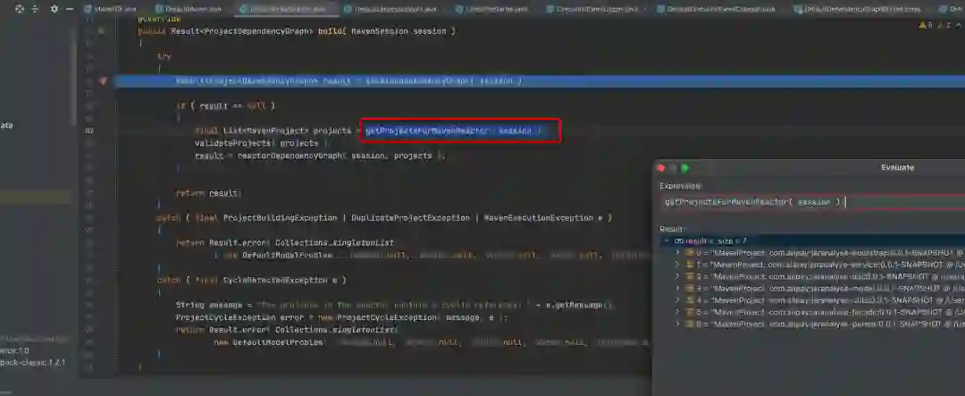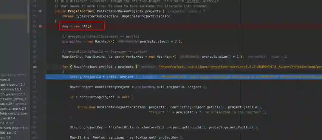 上文中我们还提到了一个非常重要的概念,就是反应堆。反应堆直接决定了各个子pom是如何决定构建顺序的。在Maven的源码中,他是在getProjectsForMavenReactor函数中进行实现的。并且我们从下图中也可以看到,Maven的反应堆是不能解决循环依赖的,他直接捕获了这种异常!