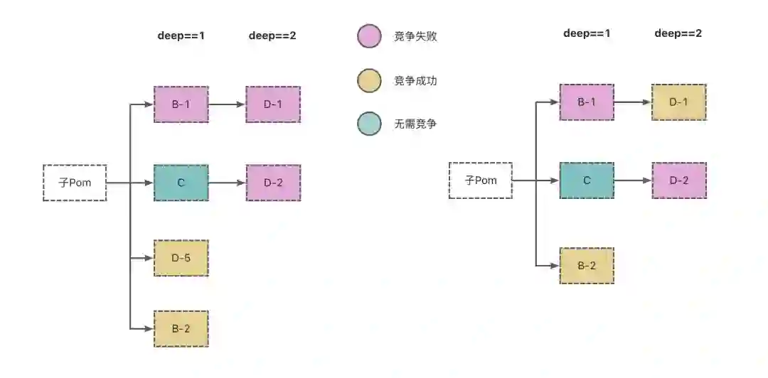 左边这个子pom生成的树依赖了 D-1,D-2和D-5。满足依赖竞争原则1,即越靠近树的左侧越优先的原则,所以D-5会竞争成功。