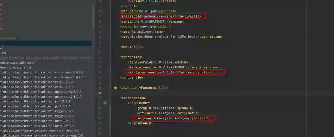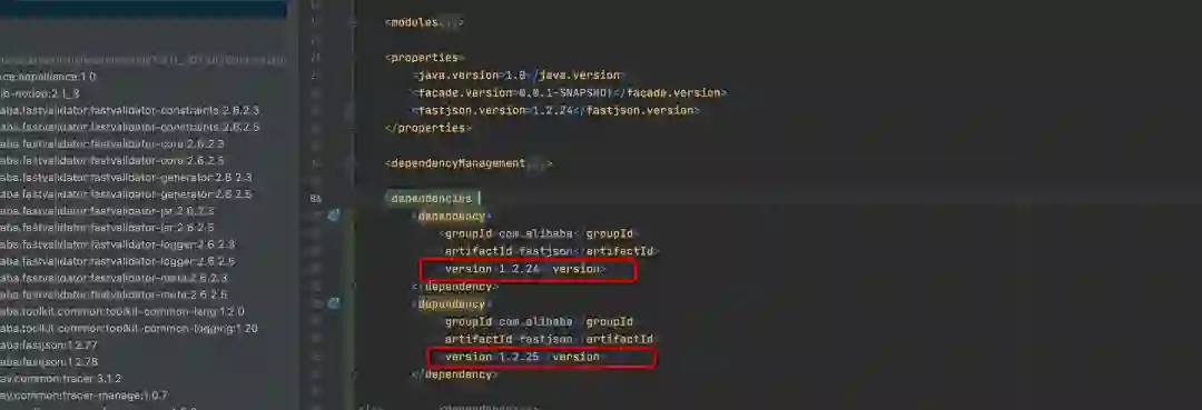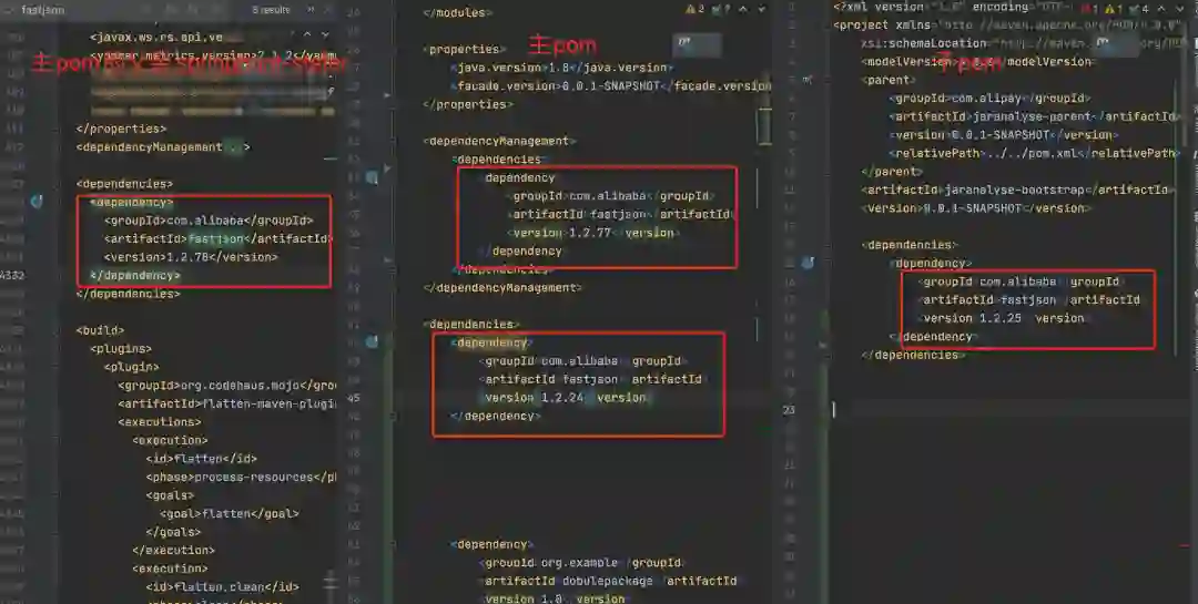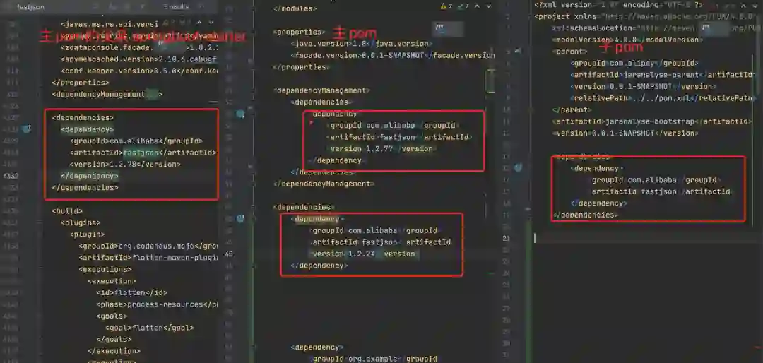 主POM的dependencies Fastjson:1.2.24 主POM的dependencymanagent Fastjson:1.2.77