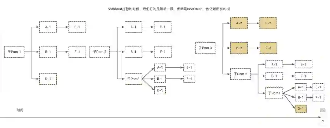 子pom3最后参与构建,而且SpringBoot打包插件一般打的就是这个module。所以最终进入到SpringBoot打包产物的有A-2,B-2,E-2,F-2和D-1。因为A-2和B-2相比于其他几个相同节点更靠近树的主干。E-2和F-2也是同理。这个规律体感上是靠后优先了,因为靠后的树天然更加靠近主干。