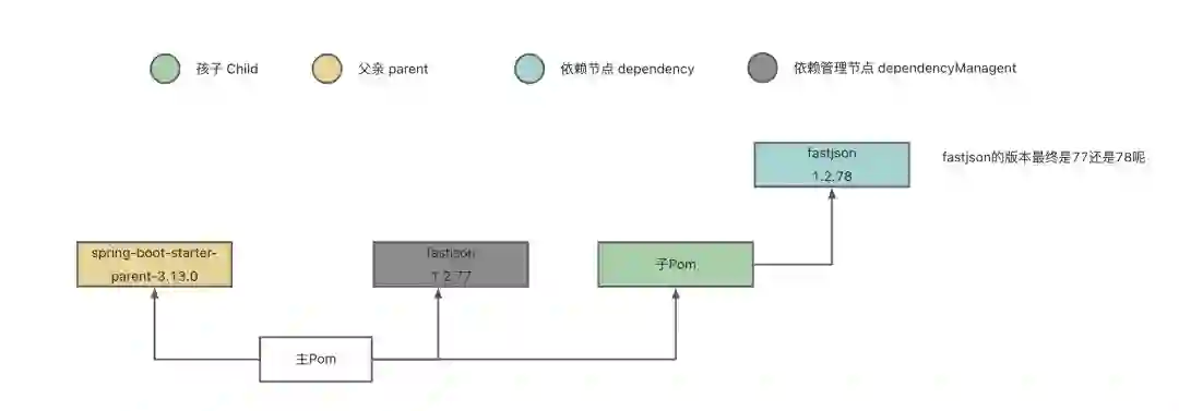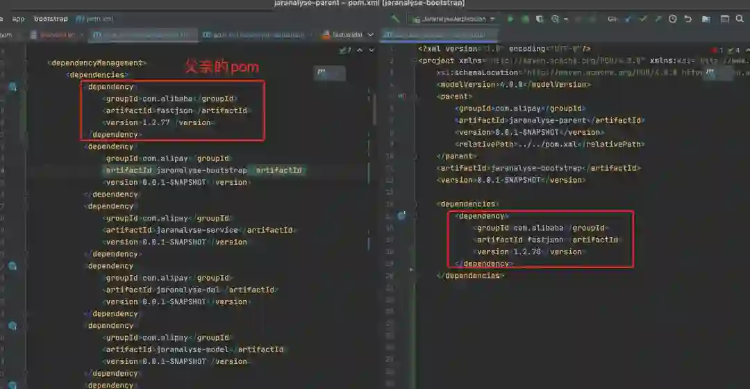 下图中左图为主POM文件内的dependencyManagement里的fastjson为1.2.77,这个时候子POM中显示声明自己的版本1.2.78。那么针对子POM这颗树,子POM会选择听从父命还是遵从内心呢?