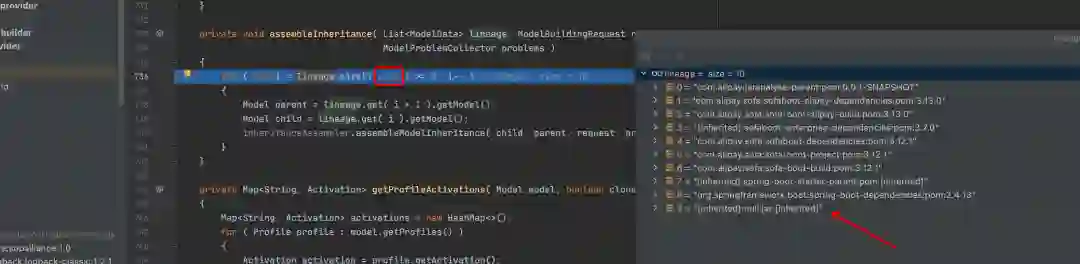 Maven中有2条非常重要的主线。一个是依赖,另一个就是继承。Maven在源码中实现继承大体如下。在下图中使用readParent进行对父亲的模型获取之后,便让自己陷入这个循环中。唯一可以出去这个循环的方式就是追不到父亲为止。并且把每次取到模型数据放到linega这个对象当中。下图中最下面的assembleInheritance我们看他消费了linega这个对象,目的就是完成真实的继承和覆盖。