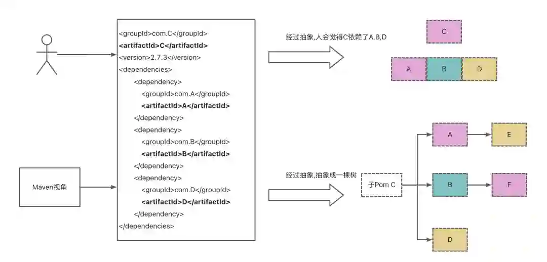 在人的视角来观察一个Pom文件的时候,我们会认为他是一个线状的一个依赖列表,我们会认为下图的Pom文件抽象出来的结果是C依赖了A,B,D。但我们的视角是不完备的,Maven的视角来看,Maven会把这一个Pom文件直接抽象成一个依赖树。Maven的视角能看到除了ABD之外的节点。而人只能看到ABD三个节点。