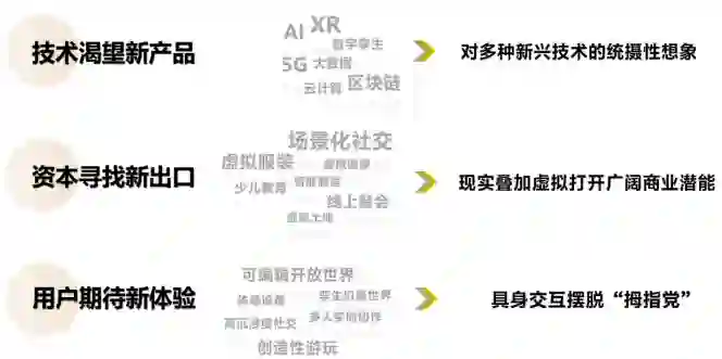 为什么今年元宇宙这个概念这么火呢?一个最重要的原因就是最近两三年时间没有新的互联网产品。这在日新月异的互联网行业是不能被接受的,所以元宇宙的概念就被人们所关注了。