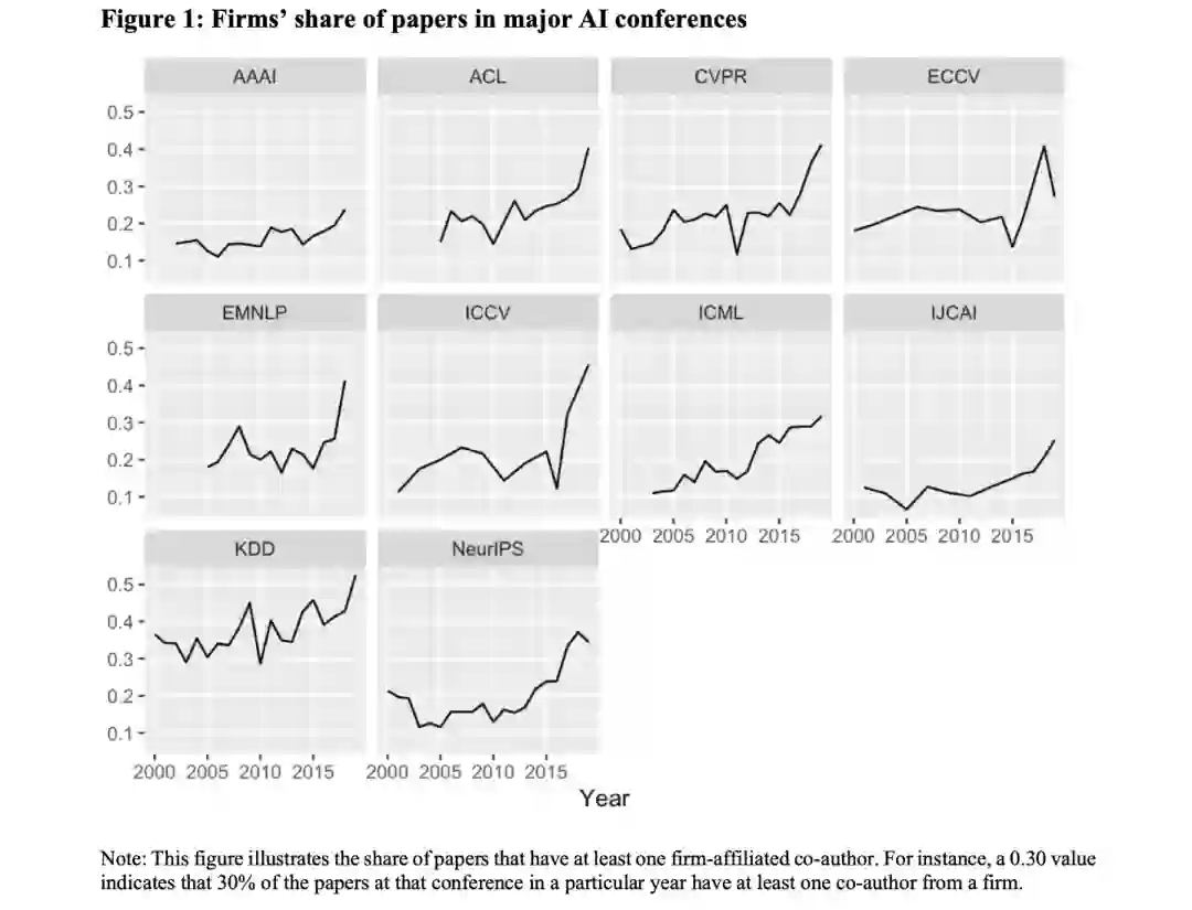 自2012年深度学习的意外增长以来,公司,尤其是大型技术公司和精英大学增加了对主要AI会议的参与;这里的精英大学指的是在QS世界大学排名中排名1-50的大学;
