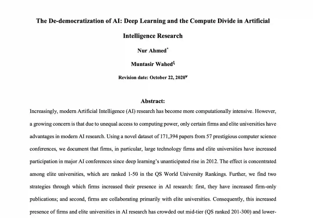 Nur Ahmed和Muntasir Wahed在一篇题为《人工智能的去民主化:人工智能研究中的深度学习和计算鸿沟》的论文中表达了对于“深度学习垄断”的看法。