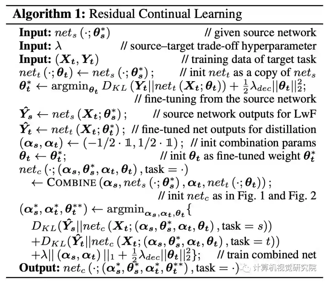 提出了一种新的连续学习方法,称为“Residual Continual Learning”(ResCL)。新提出的方法可以防止多个任务的顺序学习中的灾难性遗忘现象,除了原始网络之外,没有任何源任务信息。通过将原始网络的每一层和一个微调网络线性地结合起来,ResCL重新测量网络参数;因此,网络的大小根本不会增加。