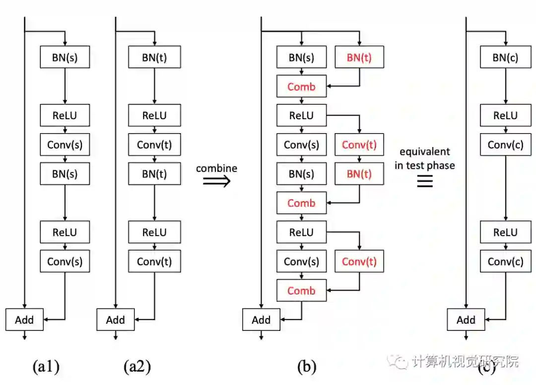 新提出的方法可以自然地应用于BN层。我们不需要担心分布的变化,因为每个子网都有自己的BN层来完成自己的任务。具体地,图中的原始BN层(下图的BN(s))应在额外的训练和测试阶段使用其源任务的人口统计。否则,一些源知识就会丢失,因为联合网络在额外的训练中无法看到和利用原始统计数据。具有组合层的两个BN和两个卷积层在训练后也可以合并成一个等效卷积层,因为BN层在推理阶段是确定性的线性层,卷积也是线性运算。