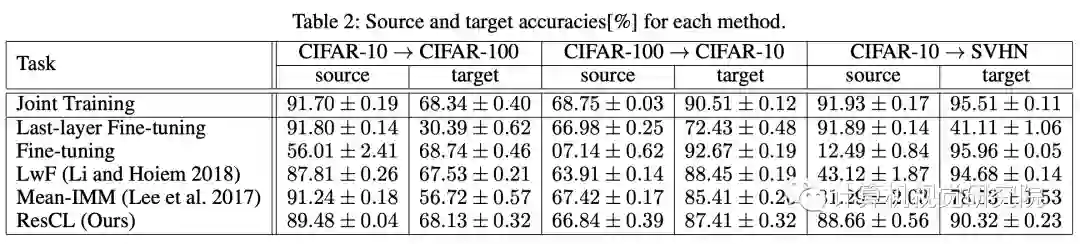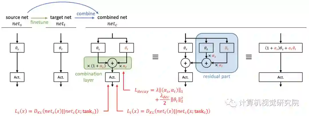 在ResCL框架中,Ws是源网络的权重,Wt是从原始网络中为目标任务进行微调的网络权重,此外,Wt还接受了训练,以完善其以便与Ws很好地结合起来,而Ws是固定的,以防止灾难性遗忘。 此外,还通过反向传播来学习组合参数,以最优地混合两个特征。 因此,组合网络中的可学习参数为Wt和α=(αs,αt)。