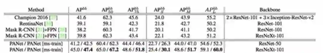 PANet 在 COCO 上的结果图,其中上侧为分割的结果对比表,下侧为检测的结果对比表