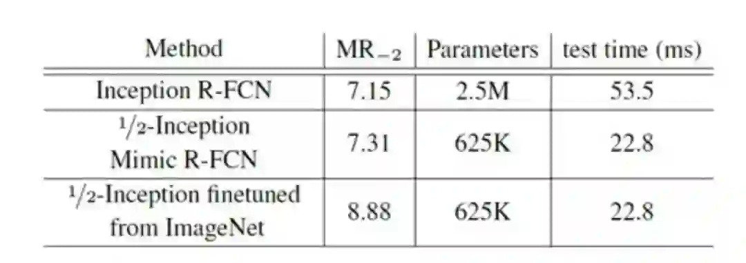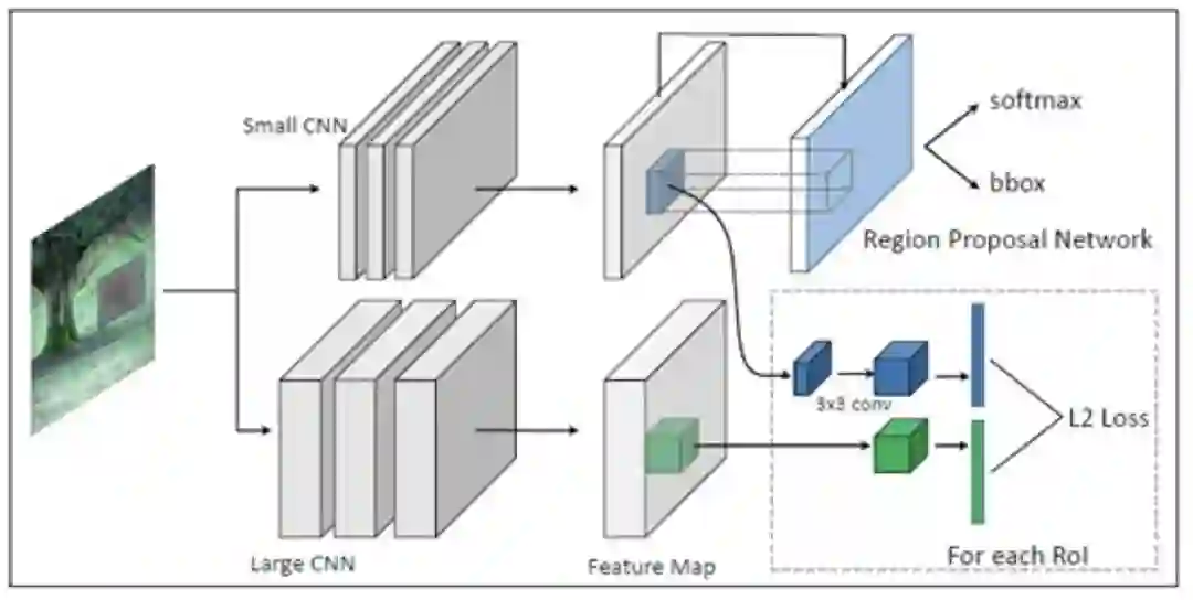 这篇论文与本综述(一)中介绍的 DSOD 的目标一致,都是解决如何有效地「从 0 开始训练检测网络」的问题。不同的是,DSOD 旨在提出一种可以实现从头训练的检测网络结构。而本文借鉴知识蒸馏思想,在训练过程中,用训练好的大网络作为监督网络指导小网络的参数学习,小网络无需用预训练模型初始化。训练得到的小网络模型用于测试。