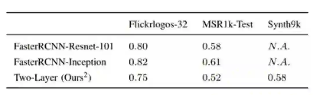 由于这篇论文针对的是logo检测的改进,所以测评都是在logo数据集上。Flickrlogos-32为开源的logo数据集,MSR1k和Synth9K为作者自己造的logo数据集。