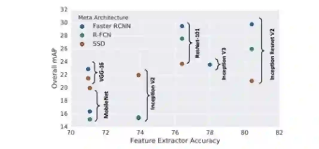 首先先说一下试验的背景:用不同的深度学习框架,不同的网络初始化方法,不同的数据增强方法等等训练相同的算法,其性能和最终准确率都会有所不同。为了去掉这些因素的影响,作者统一在 tensorflow 的框架上实现了 Faster R-CNN、SSD、RFCN 算法,并以此为基础进行试验,保证了试验的公平性,其中有部分的参数初始化方法以及优化方法略有不同,在论文中均作了说明。同时为了保证基础特征的公平性和丰富程度,作者分别在 VGG16、ResNet-101、Mobilenet、Inception-V2、Inception-V3、Inception-ResNet 上进行试验,使得结果具有更高的普适性,同时也能从基础网络的角度看到了不同网络对于不同算法准确率和速度的影响。作者还对比了不同图像输入尺寸在以上这些网络上的表现。最后作者还对比了各个算法不同的预选框的设置方法,某些网络特定层的特征分辨率的不同等等设置对于网络的影响。可以说作者整个的试验设计非常系统,非常严谨。通过作者的试验结果,可以从各个角度对于当前目标检测的网络选择和参数设置有一个很直观的认识。