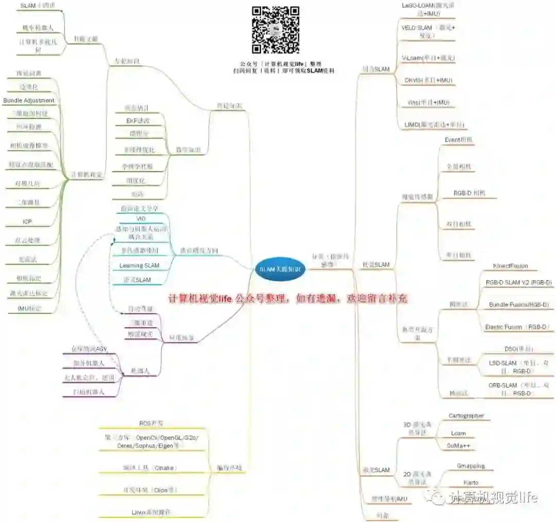 我们总结了 SLAM 学习资源树,包括需要掌握的知识点、主要研究方向、知名研究实验室、知名会议期刊等信息,(点击看大图)