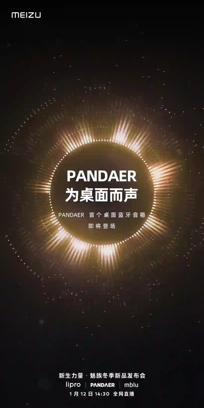 魅族今日官宣 PANDAER 桌面蓝牙音箱,这是魅族首款桌面音箱产品,该产品将会在 1 月 12 日 14:30 的魅族新生力量冬季新品发布会上发布。上周魅族已预热将发布 PANDAER 品牌全新产品线「PANDAER 潮电」系列,预计是一款移动电源类产品。从官方的说法来看,此次发布会魅族将推出 Lipro、PANDAER、mBlu 等多个系列的新品,涵盖智能家居、魅蓝手机、配件周边等多种产品。