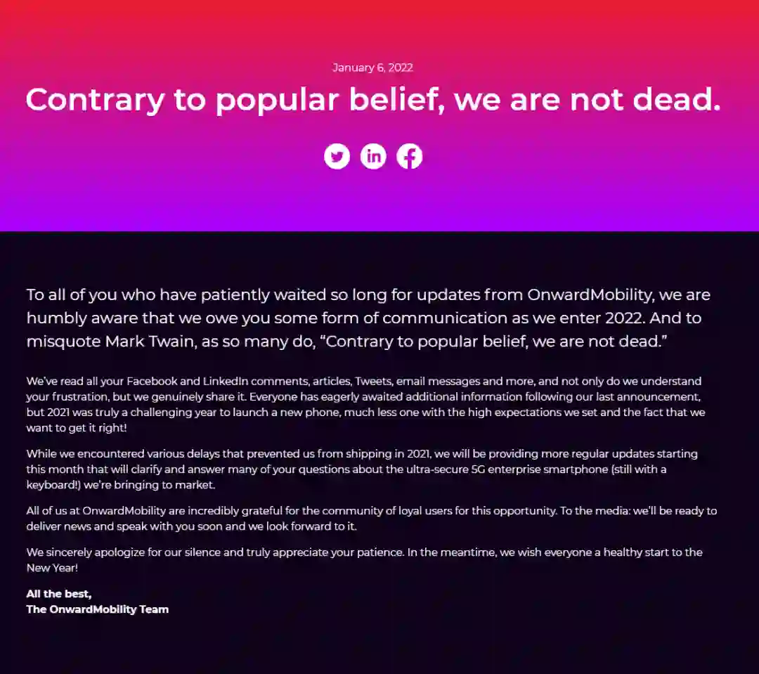 OnwardMobility 日前发布了一篇新博文,重申了推出 5G 黑莓手机的意愿,仍会推出配备物理键盘的“超安全 5G 企业级智能手机”。2020 年 8 月,Onward Mobility 宣布,将联合黑莓、富智康(富士康子公司)推出新款 5G 黑莓安卓手机,但这款新手机至今仍渺无音信。截至目前,黑莓手机已有三年未推出新品,不仅如此,黑莓上周还宣布终止 BlackBerry OS 设备服务支持。