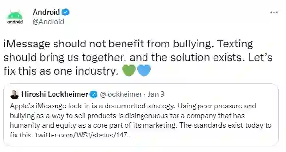 Android 和 iOS 一直被不少人视为“开放”与“封闭”的对立面。近日,谷歌高管、Android 高级副总裁 Hiroshi Lockheimer 针对华尔街日报的“iMessage 如何取得青少年青睐”推特发表了一些看法,他认为 iMessage 的封闭体制是一种“霸凌”(bullying)行为,并称这样的行为“不诚实”。随后,Arstechnica 编辑则留言称:“从 2011 年 iMessage 推出至今,谷歌已经发布过 13 款不同的通讯应用,输了也是活该”。