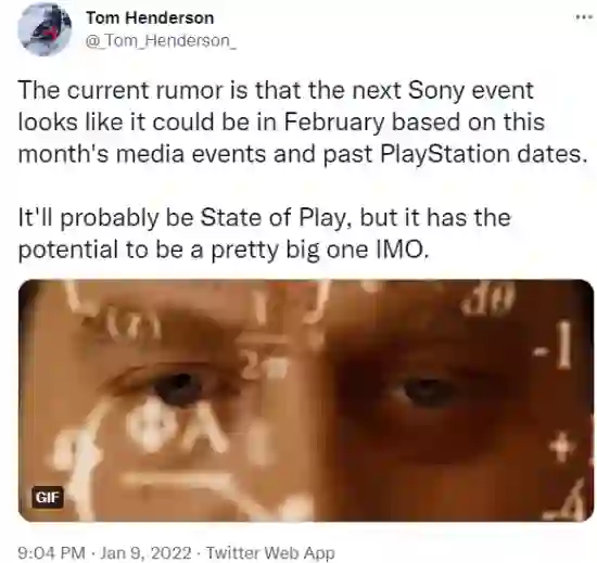 据外媒消息,索尼可能会于 2022 年 2 月举办线上 PlayStation 发布会。知名爆料人 Tom Henderson 也表示:“从以往索尼举办活动的日期和相关消息来看,索尼可能会于 2 月举办活动,可能是 State of Play,但也可能会公布一些重磅消息。”如果消息属实的话,索尼可能会在发布会上公布《霍格沃兹:遗产》以及《幽灵线:东京》等计划在 2022 年初推出的游戏。