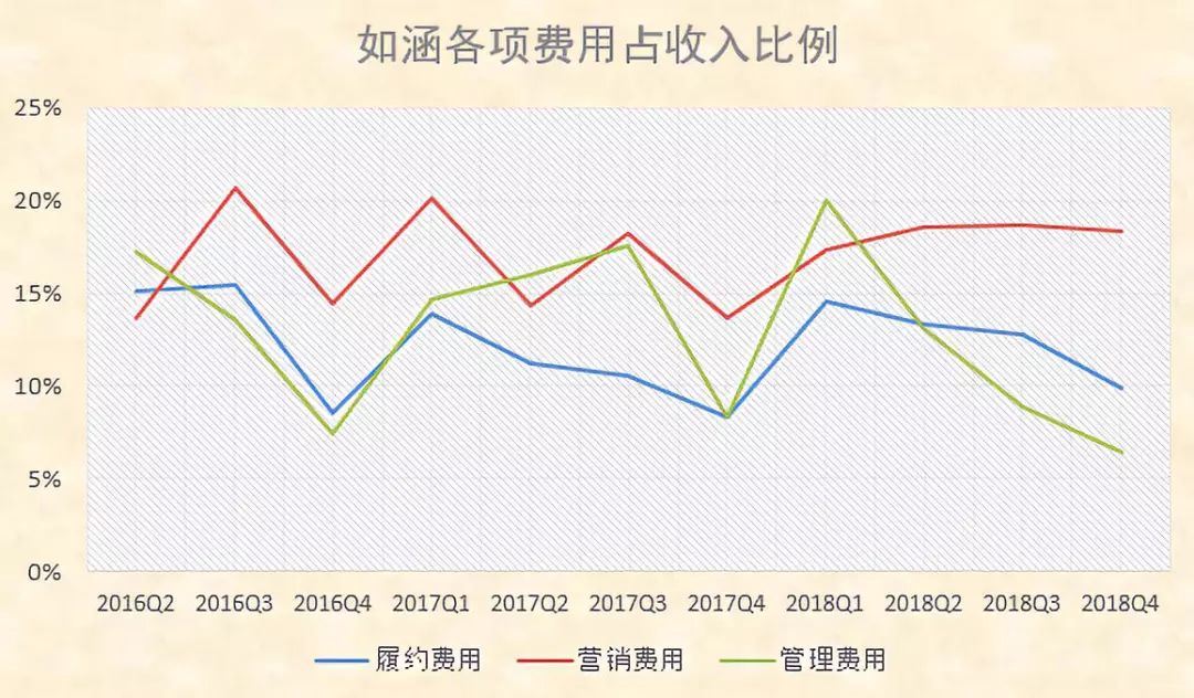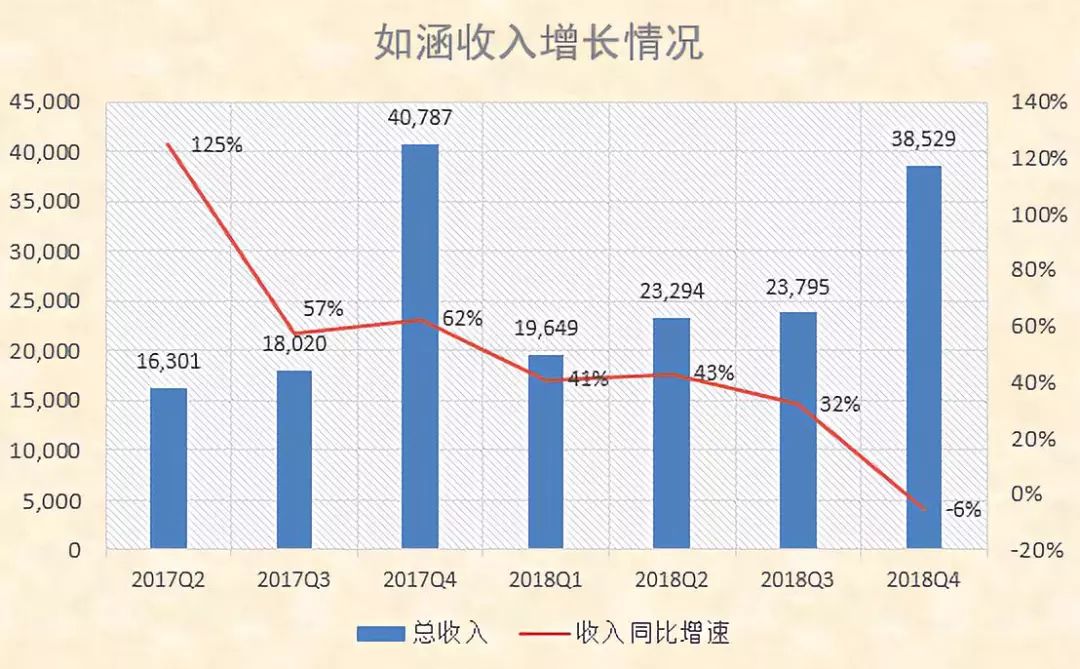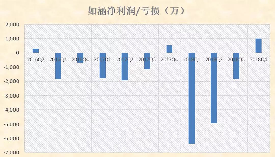 从2017年Q2开始,如涵的季度营收同比增速整体持续下滑,从2017年Q2的125%,降至2018年Q4的-6%。这是过去连续七个季度,如涵首次出现营收同比负增长。